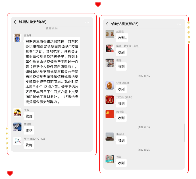 為響應黨中央號召,2月28日,誠瑞達集團黨支部根據(jù)天津市委組織部和河東區(qū)委組織部倡議精神,號召集團公司總部全體黨員同志開展疫情期間”特殊黨費“捐款活動。
